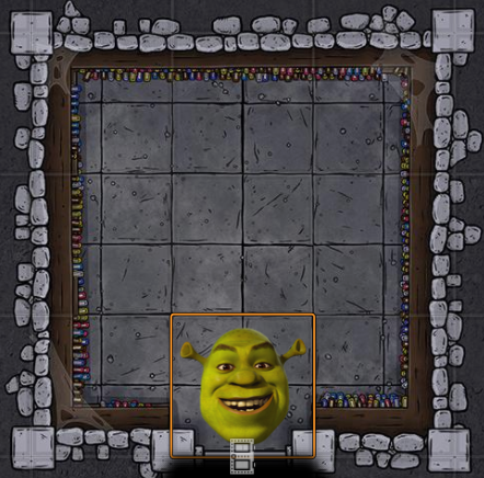 Dans l'exemple ci-dessus on a une porte normale en haut et une porte cachée en bas. Quand on quitte le mode murs pour le mode de tokens, des boutons apparaissent qui permettent d'ouvrir et fermer avec un clique gauche, et verrouiller les portes avec un clique droit (réservé au MJ, empêche les PJs de changer leur état).